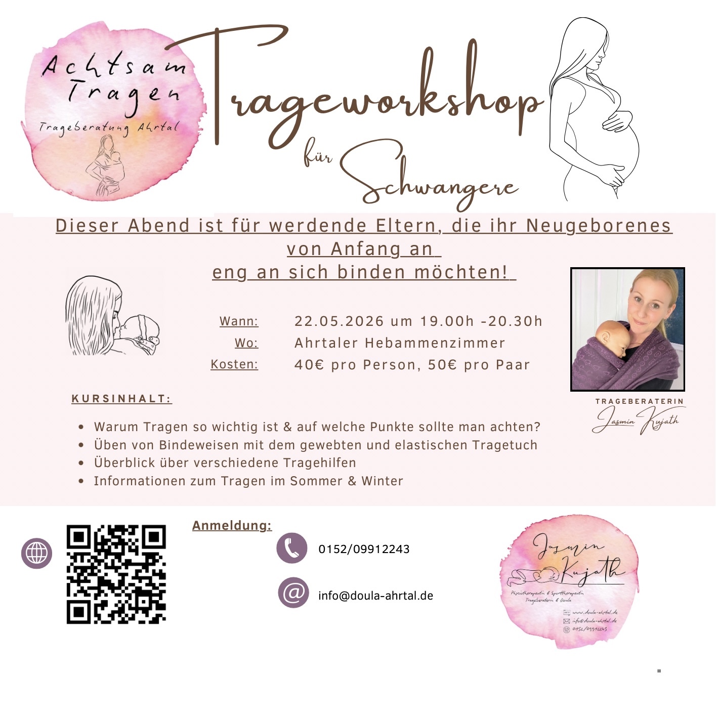 An diesem ganz besonderen Abend bekommt ihr Informationen zum sicheren Tragen, zur Anatomie und zu verschiedenen Bindetechniken mit dem elastischen und festgewebten Tuch. Auch einen Überblick über verschiedene Tragehilfen, sowei das Tragen im Sommer und Winter wird euch an diesem Abend vorgestellt.